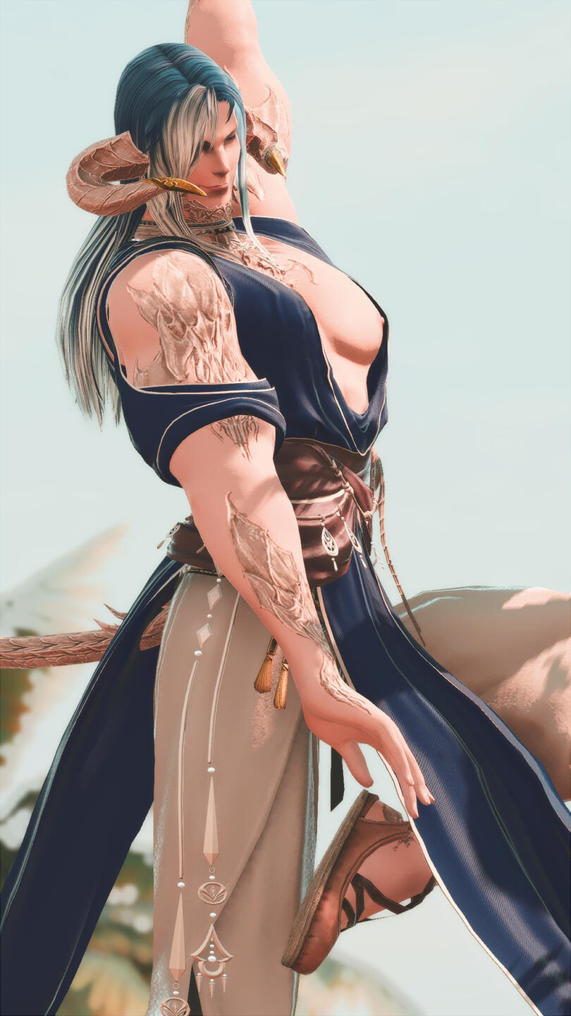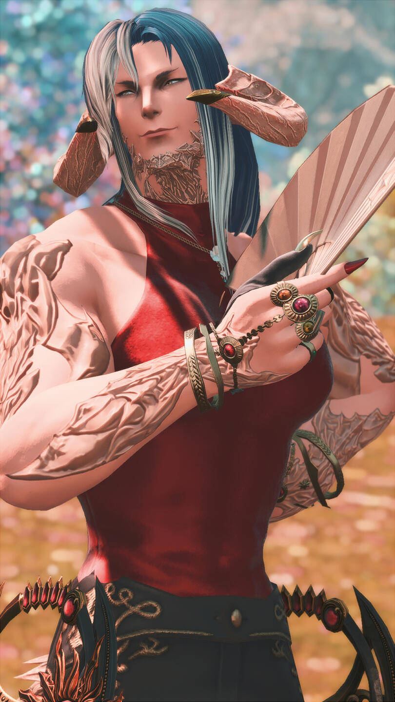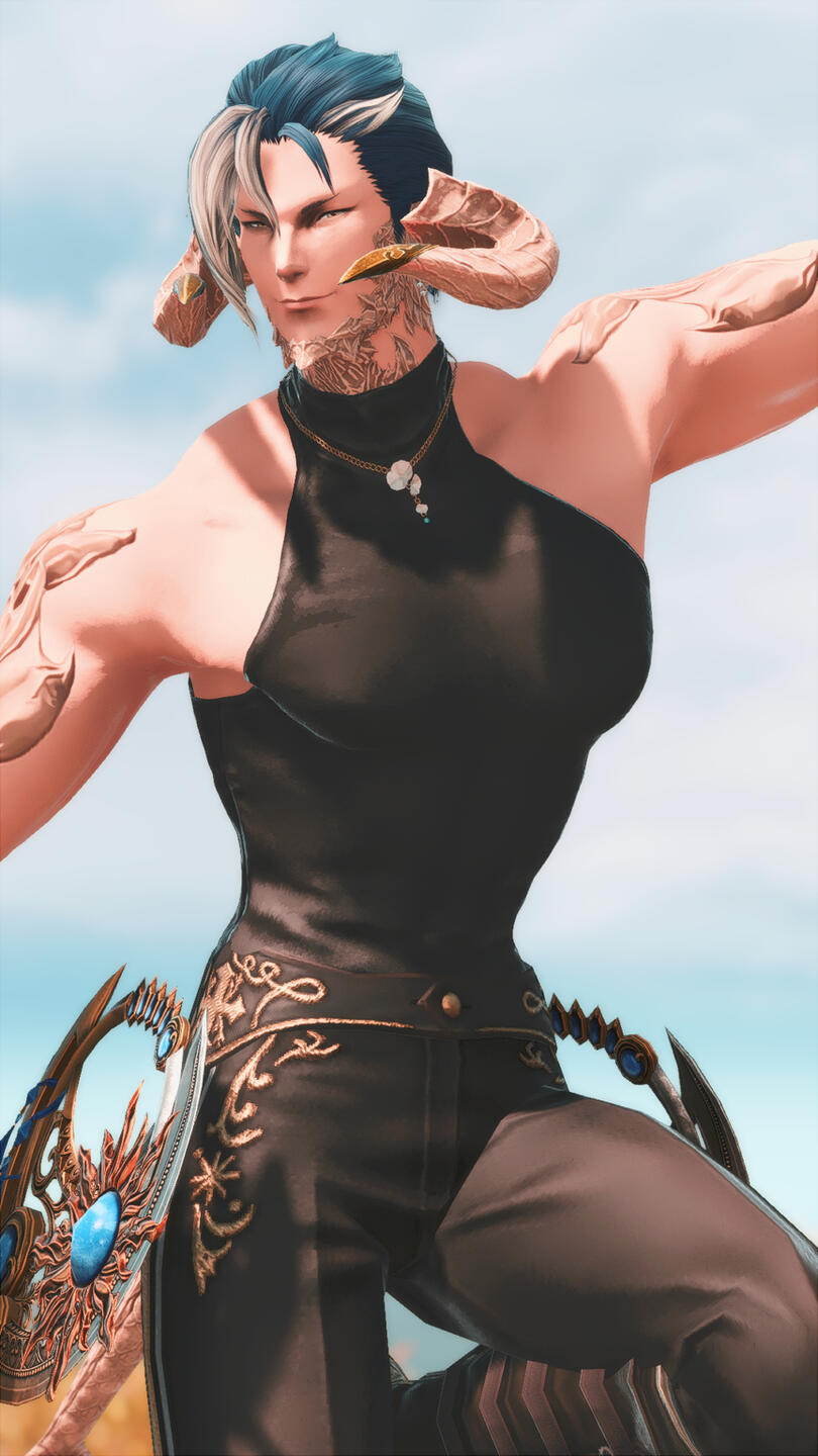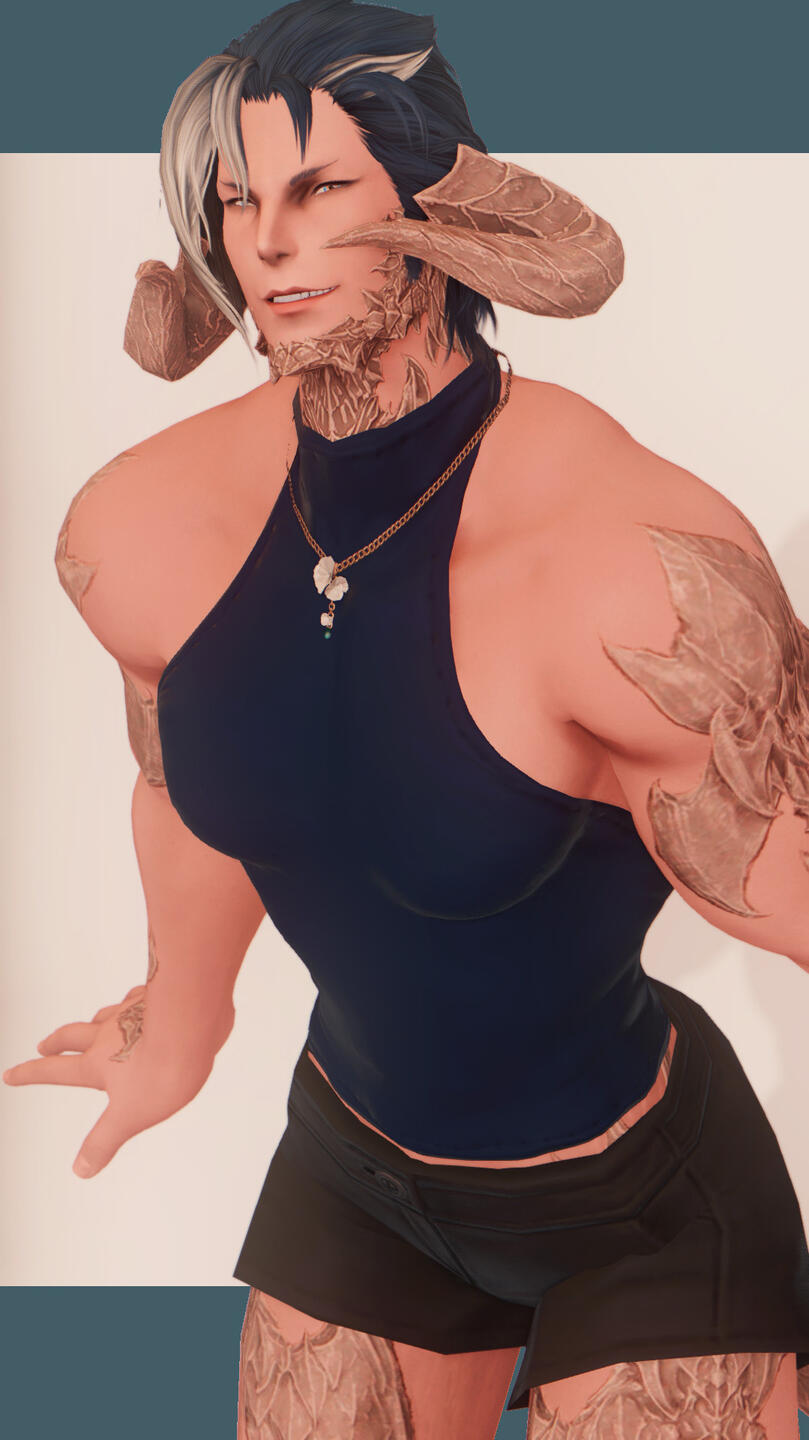 JOBS: BLU, BRD, and DNC in all canons. additionally, DRG and ARK (arch knight, custom class) in WOLverse.APPEARANCE: fairly tall and muscular, with low body fat. very hourglass-shaped figure, with a broad chest, small waist, and wide hips. regularly glamours over any combat scars. takes good care of his skin and hair, and keeps his clothes clean. has turquoise limbal rings that are given to all arahata men upon coming of age. has stretch marks on his hips and thighs that he sees as signs of masculinity and adulthood.
